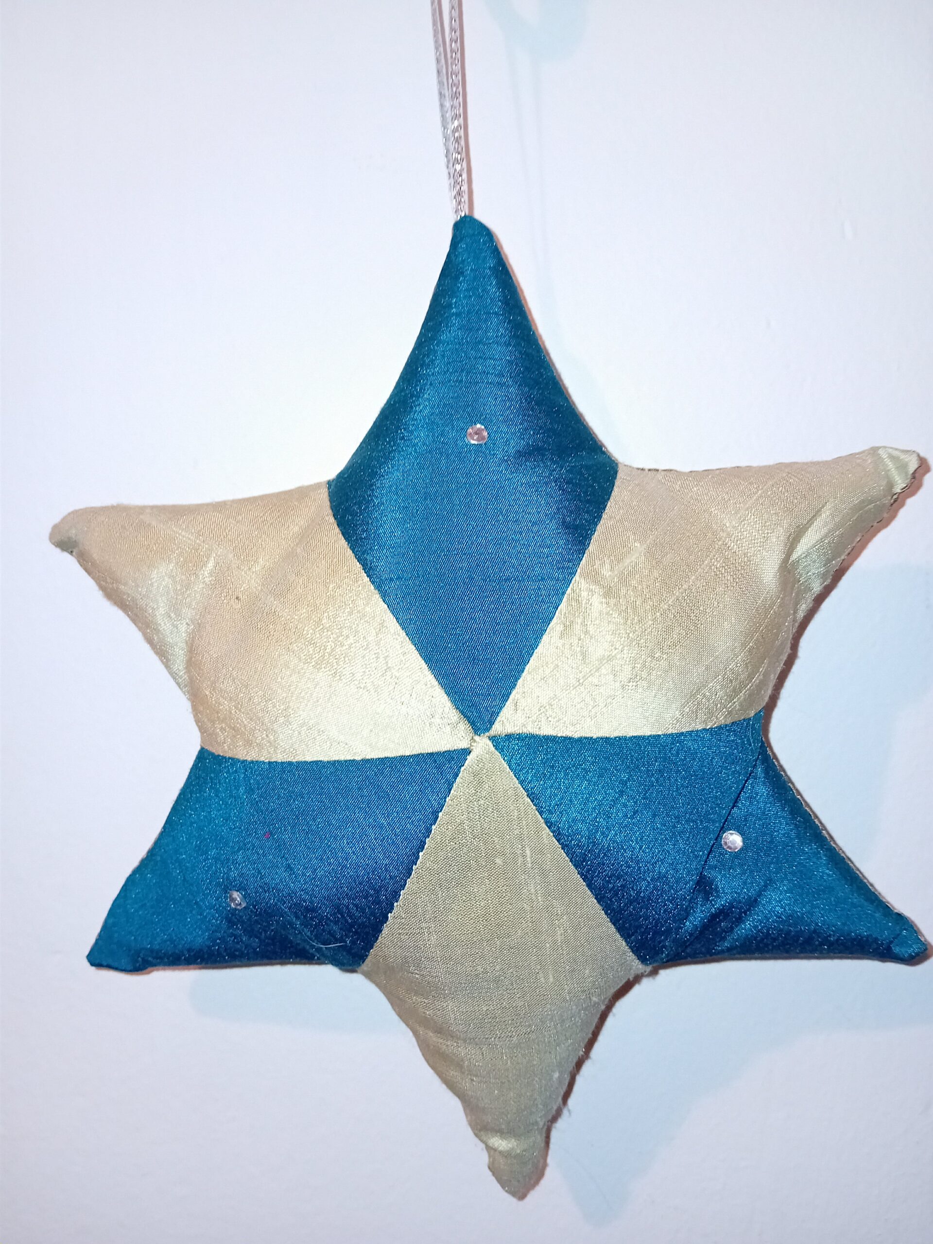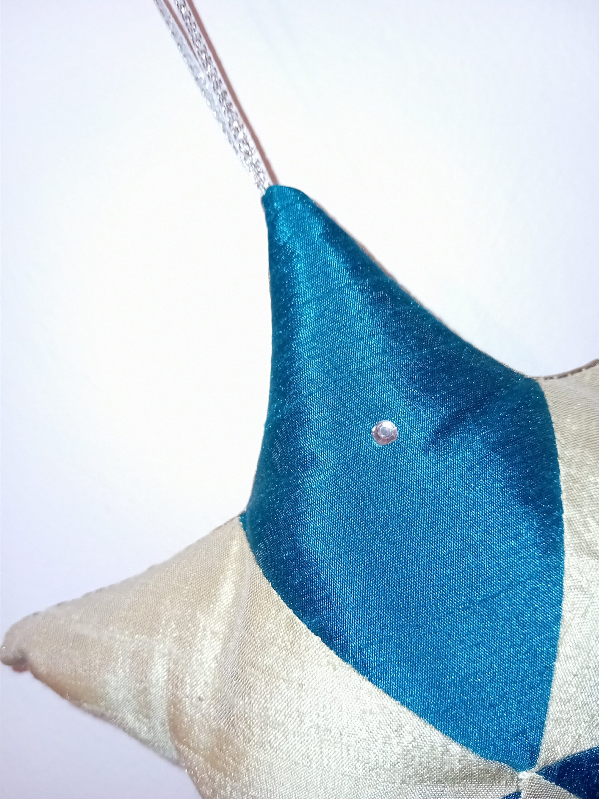 Created from repurposed deep turquoise silk with tiny white and silver jewel, with contrasting pale green rustic silk alternating between.