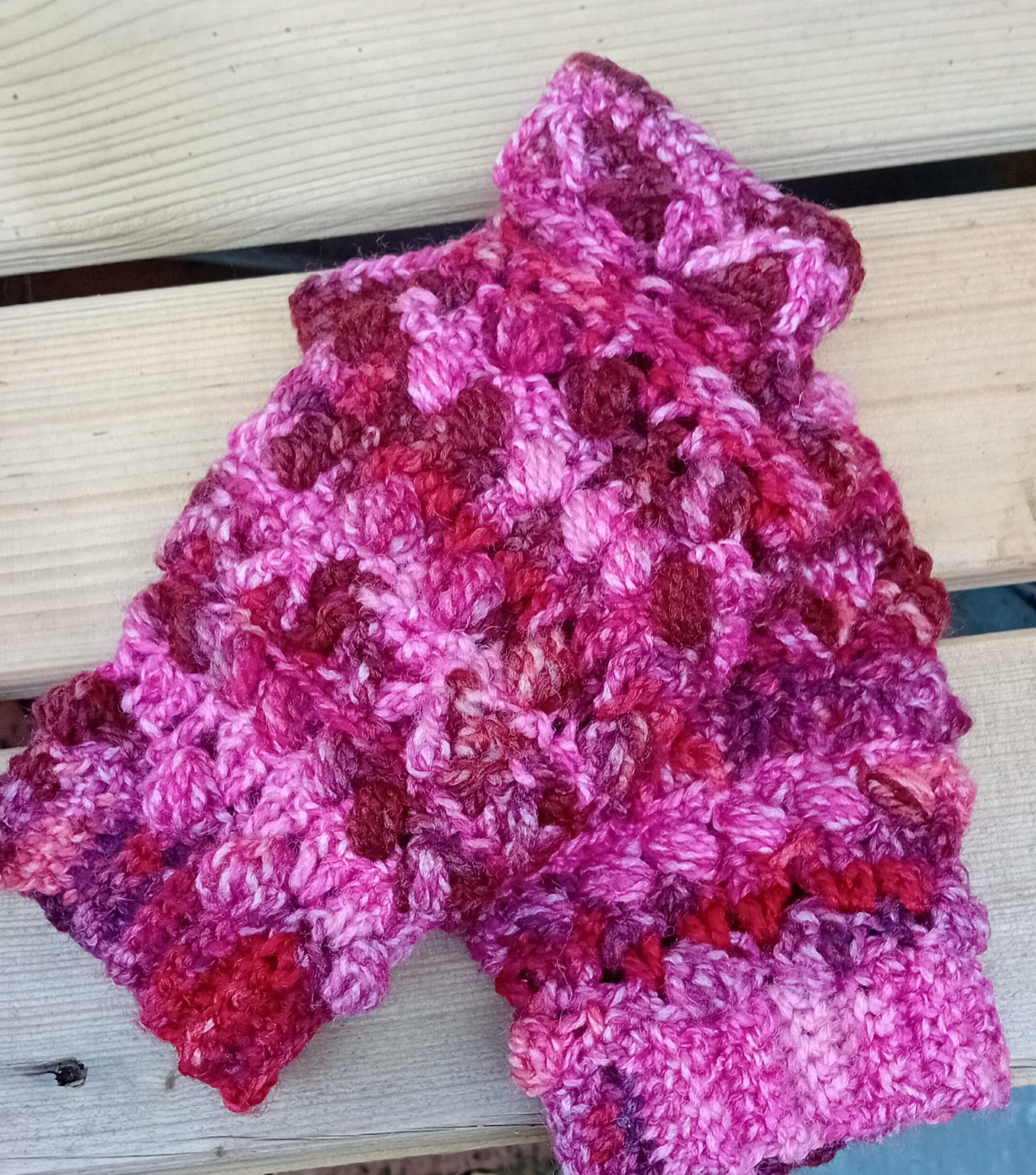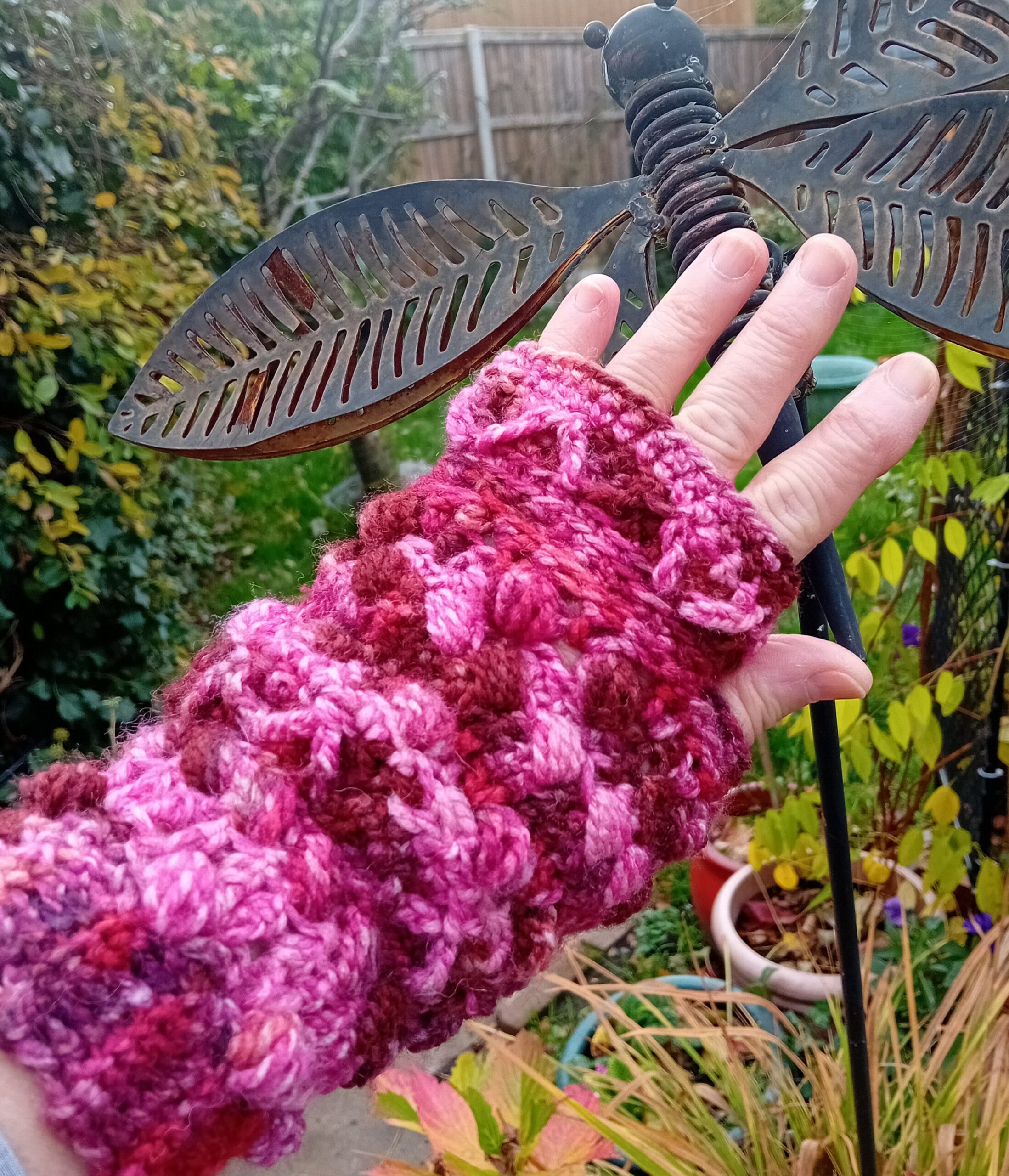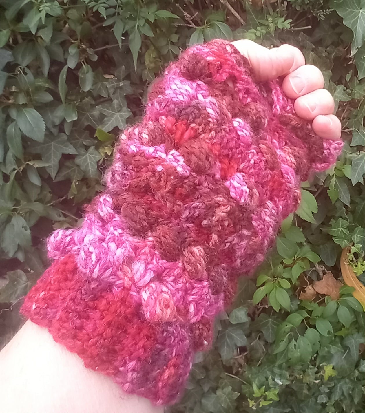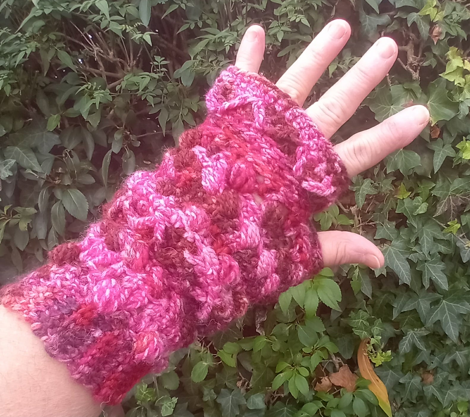 JJ’s one-of-a-kind, fingerless gloves: snuggly warm, and soft to the touch, look and feel wonderful and will compliment any outfit. The deep red, through shades of pink, with a variegated effect provides rich, and playful gloves with a cozy, crochet texture. Think of them as a pair of sweet, bright and playful accompaniments, for perfect, autumnal evenings. Perfect for curling up by a glowing hearth, where fairies tell secret stories in sparks and embers.