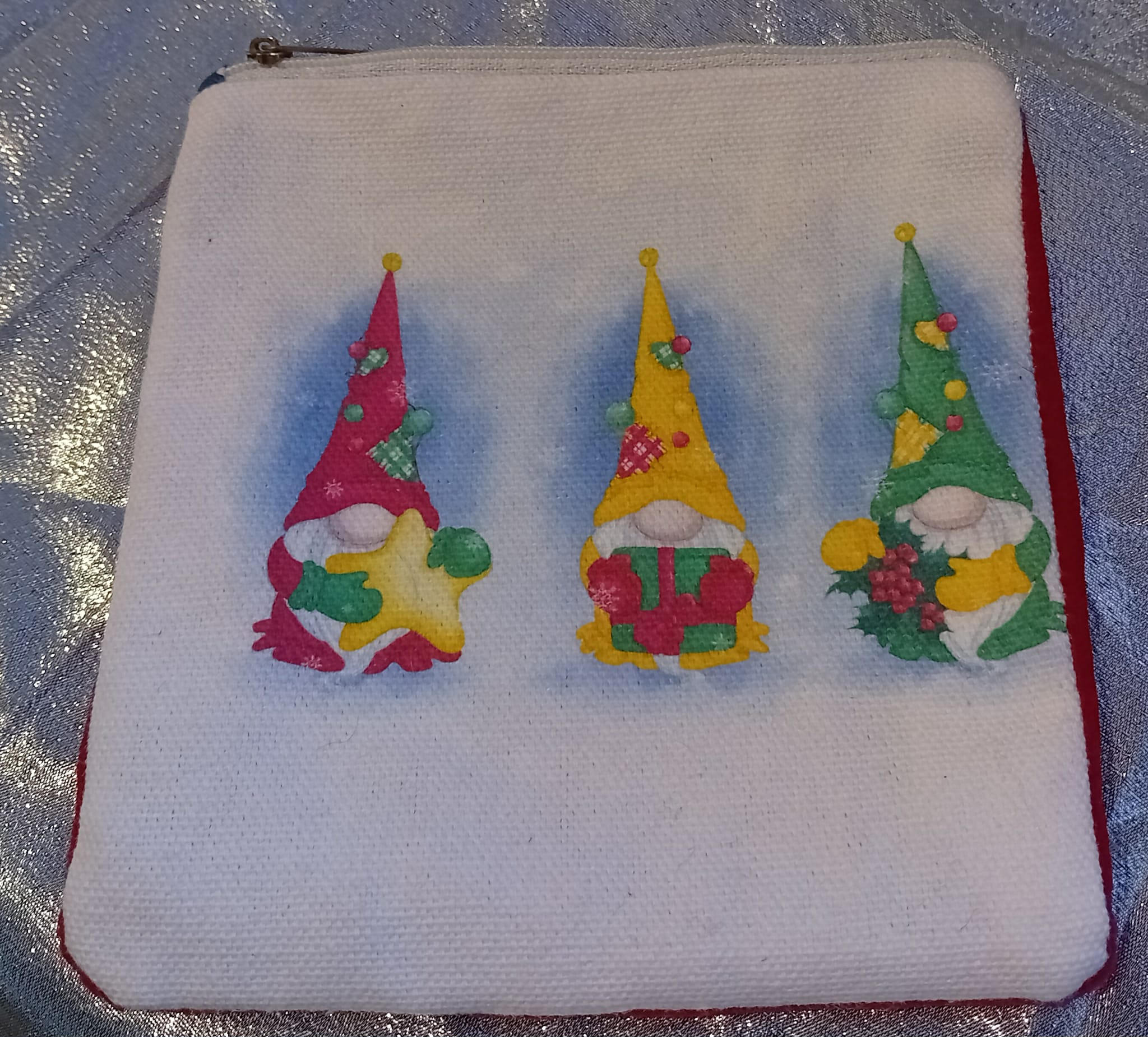 Three charming Christmas gnomes stand proudly in a soft pale blue haze — red with a golden star, yellow with a gift wrapped in red, and green with holly and berries — each radiating whimsical seasonal cheer as they hold their gifts in a soft blue haze.