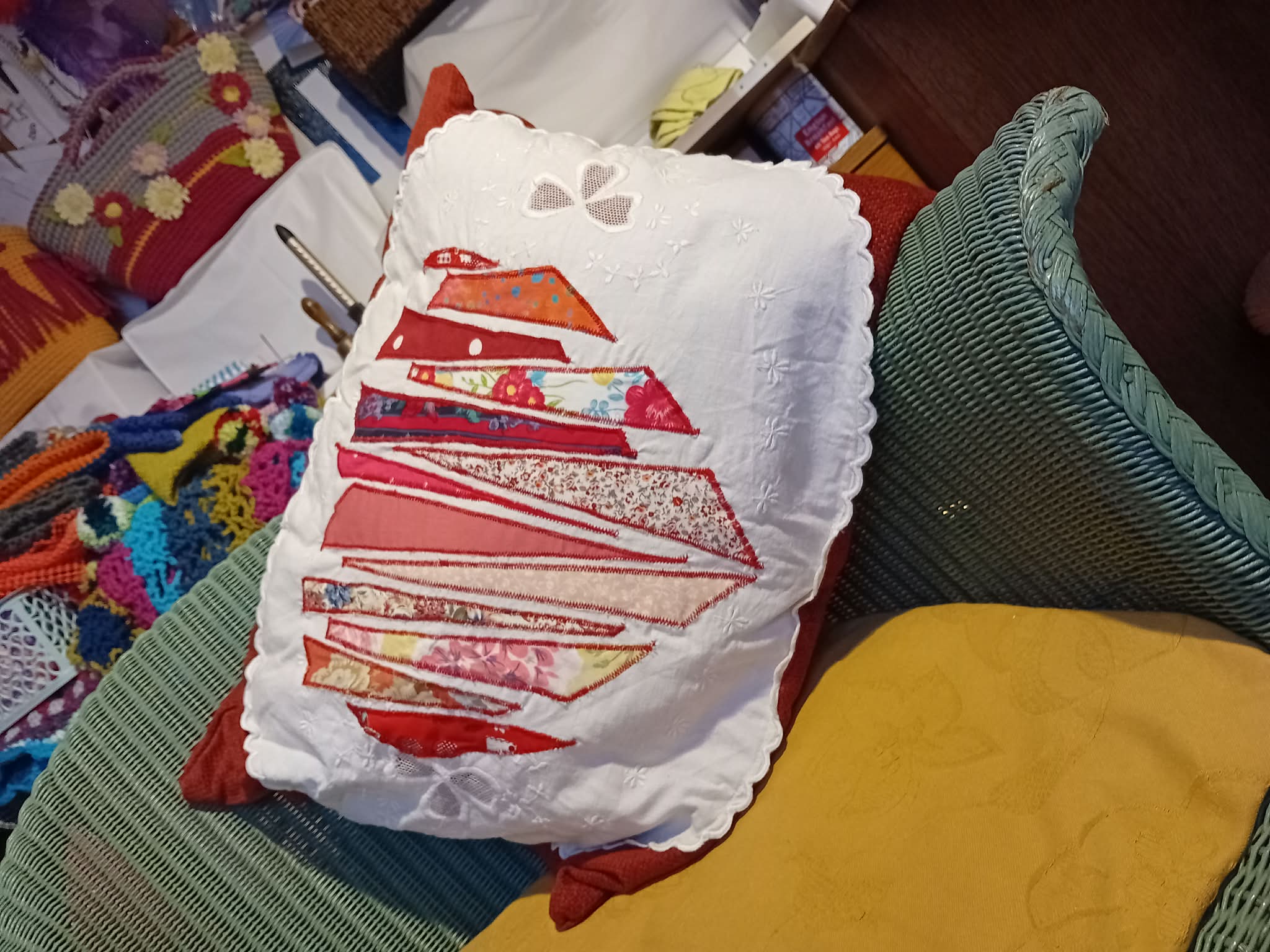 The exploding heart on this luxurious cushion has been created from oodles of left-over vintage and repurposed fabrics. JJ believes there’s always a magical use for even the tiniest scrap of cloth.