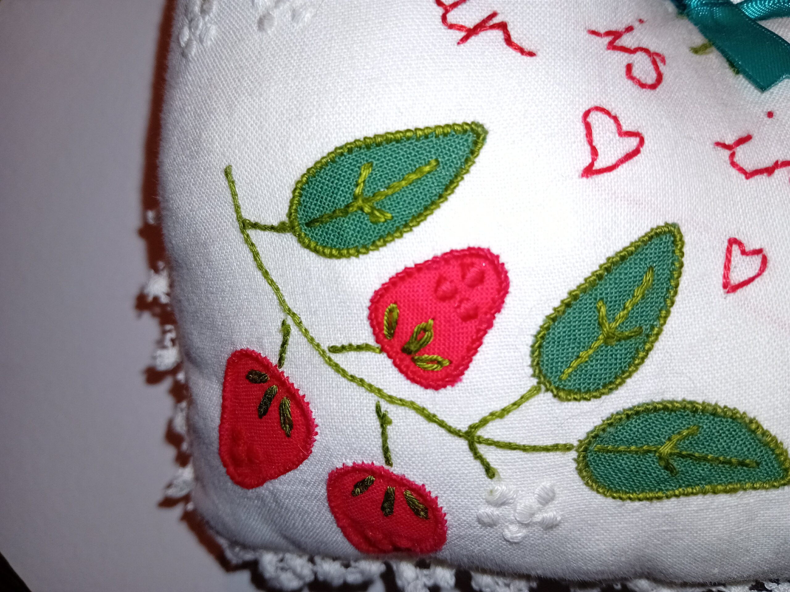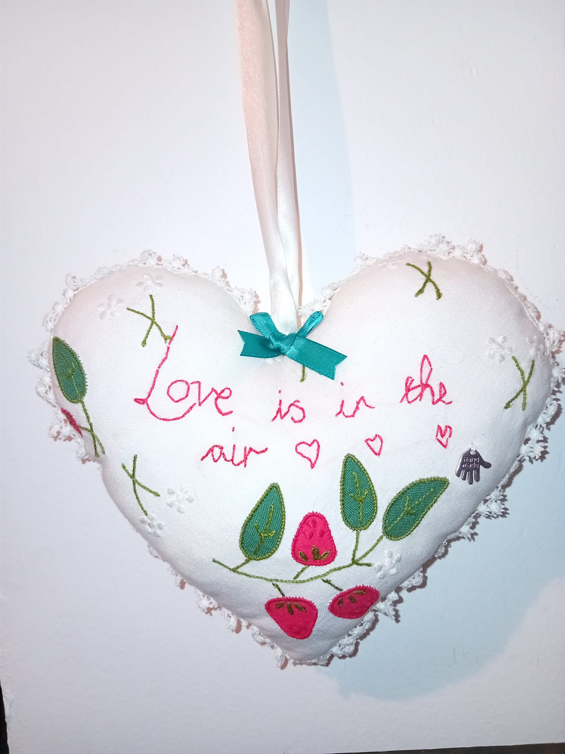 A one-of-a-kind hanging heart, handcrafted from upcycled linen and finished with a fun, hand-embroidered message designed to bring a smile to its new home. Each heart is unique and hangs beautifully on a wall, a door handle, or even the corner of a mirror — a tiny treasure made to brighten any space. Every heart has a story to tell, and every story deserves a home.