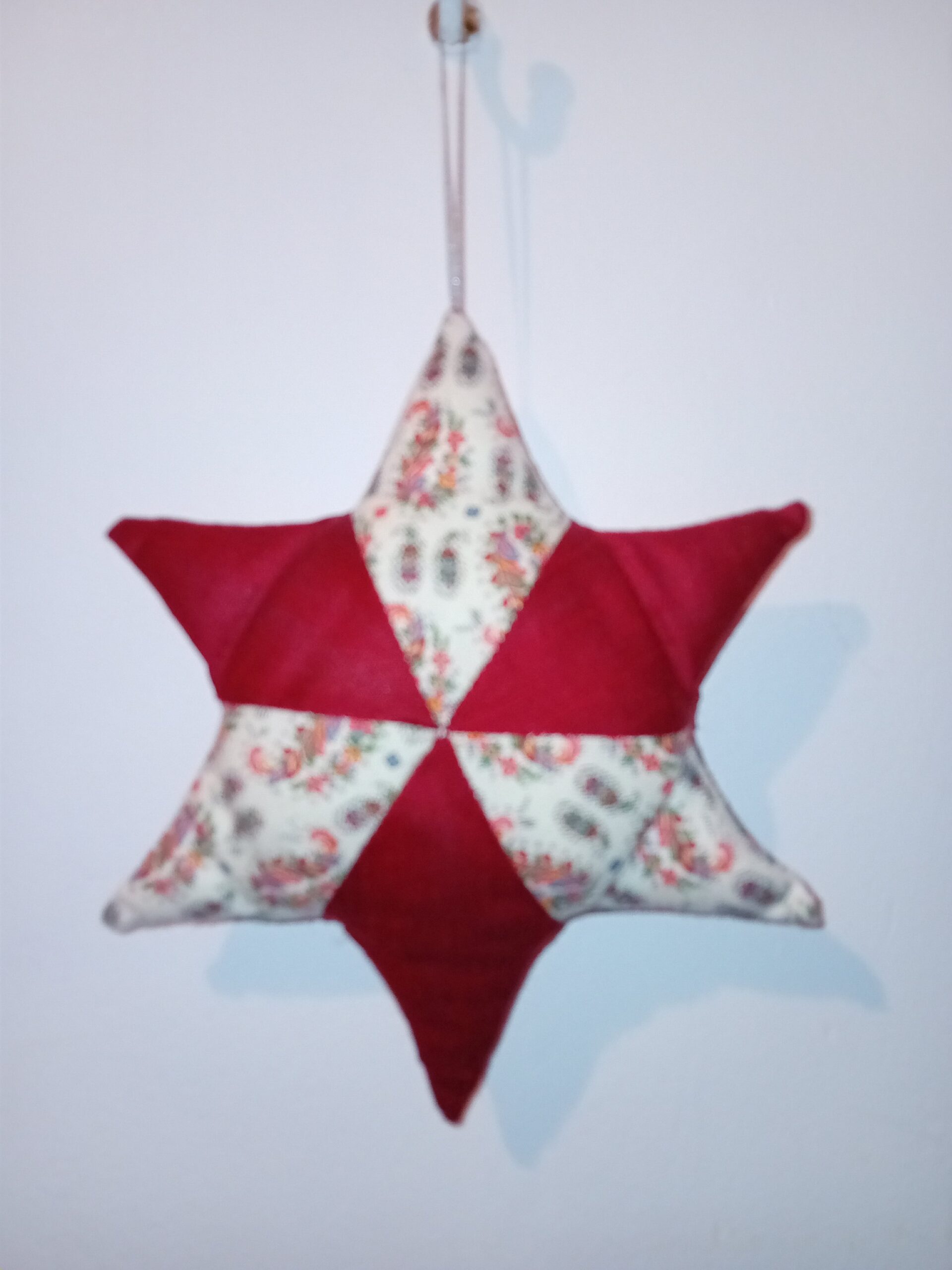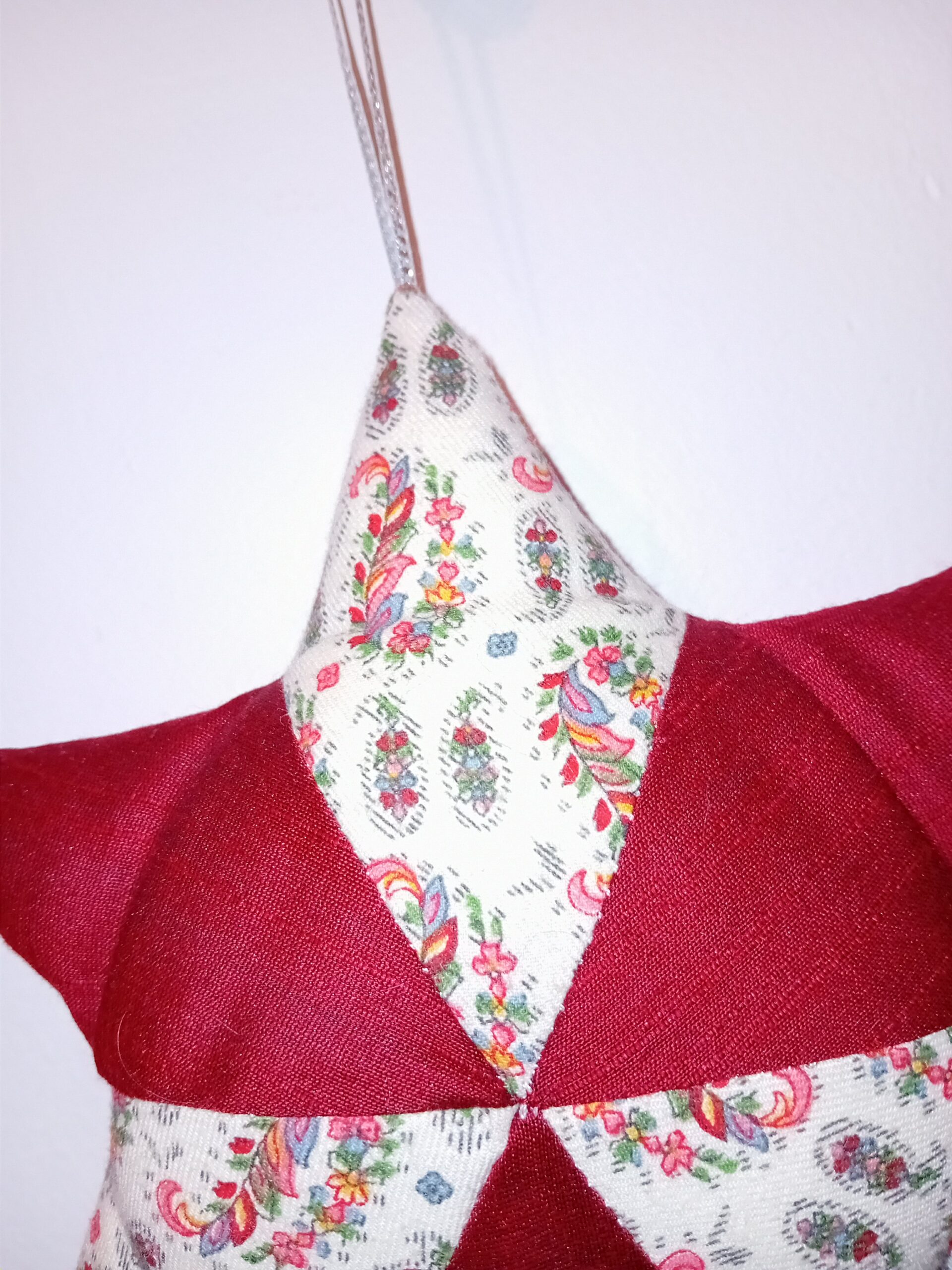 Petal Drift has been created from repurposed red silky fabric, alternating with white cotton decorated with long, delicate floral flurries, almost gladiolus-like, in all colours.