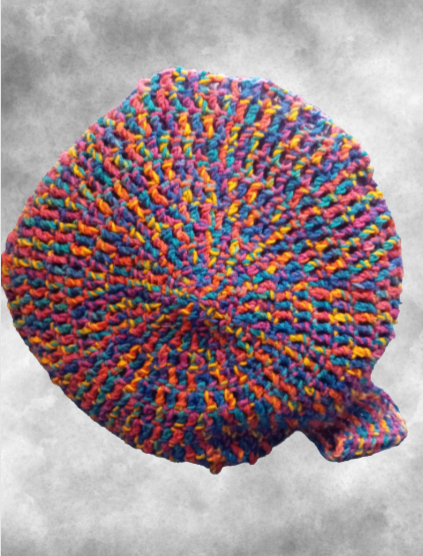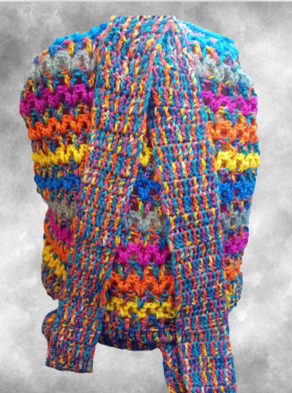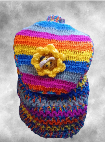 Born from a bundle of discarded yarns, Rainbow Buzz is a kaleidoscope of crochet, alive with stripes that hum with happiness. Each shade was chosen by chance and stitched with intention, giving this one-of-a-kind backpack her bold personality and irresistible charm.
