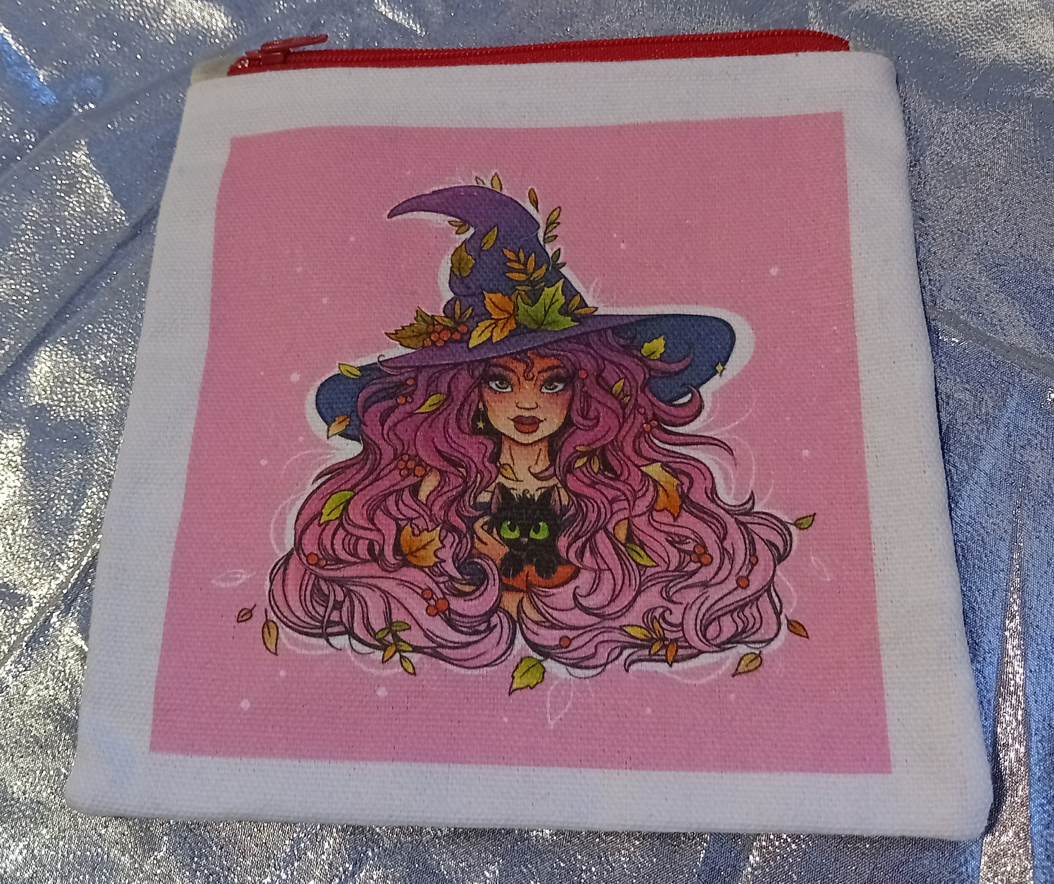 A pocket-sized spell of sweetness and sass. This zipped purse features a young, enchantingly funky witch set against a soft pink background. Her big, curious eyes peek out from beneath a wonderfully scruffy purple hat — the sort that’s clearly seen a few magical adventures — and it’s tangled with woodland leaves like she’s just wandered in from a moonlit forest. Her flowing curls shift from pale rose to deep pink, giving the whole piece a dreamy, enchanted glow.