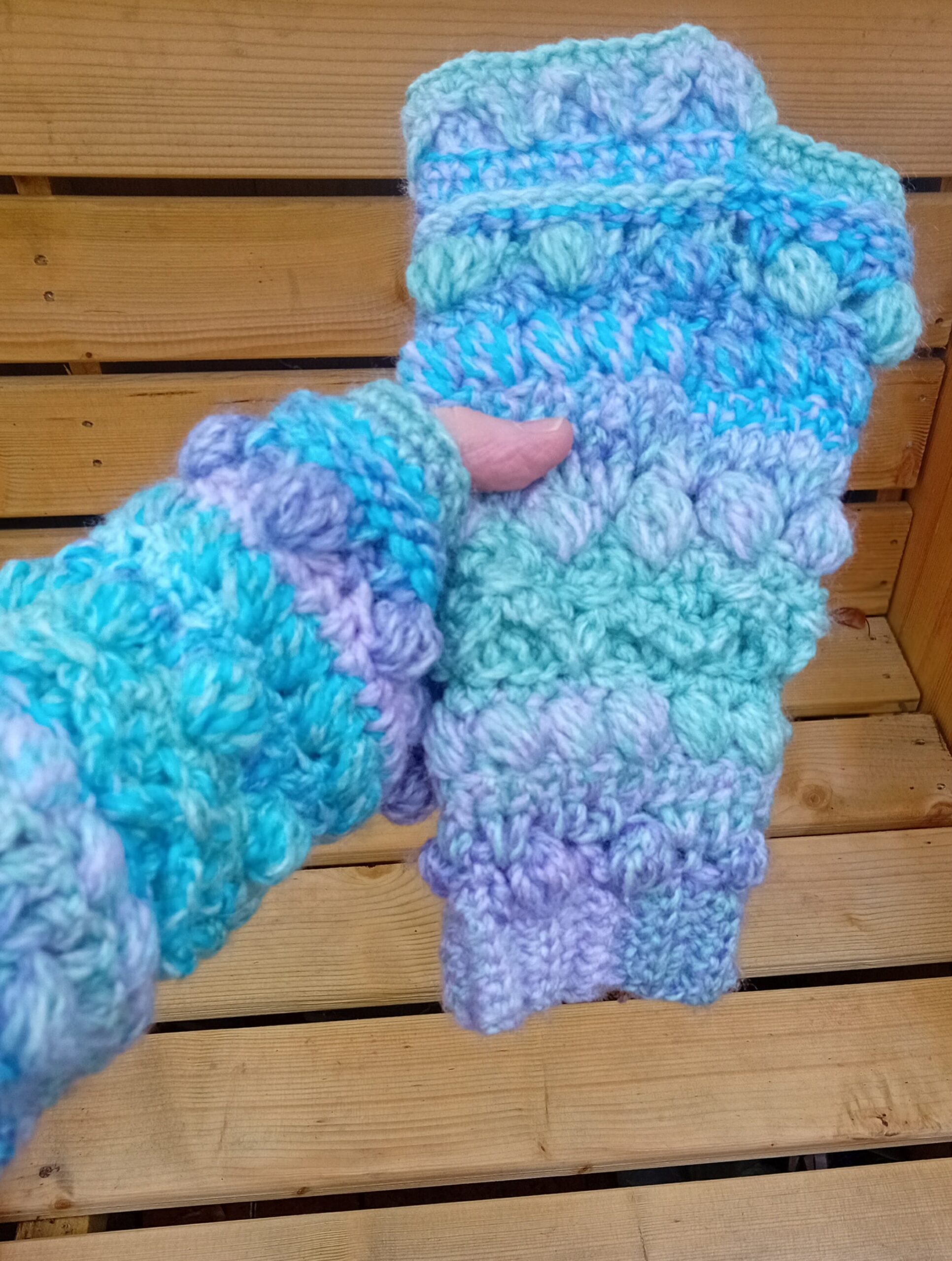 JJ’s one-of-a-kind, fingerless gloves: snuggly warm, and soft to the touch, look and feel wonderful and will compliment any outfit. These are a dreamy, variegated pale blue to lilac, to grey and to green blend, with blended flecks, soft and cosy crocheted textured pair; complete with bobbles and zigzags as the stitches bounce throughout the gloves.