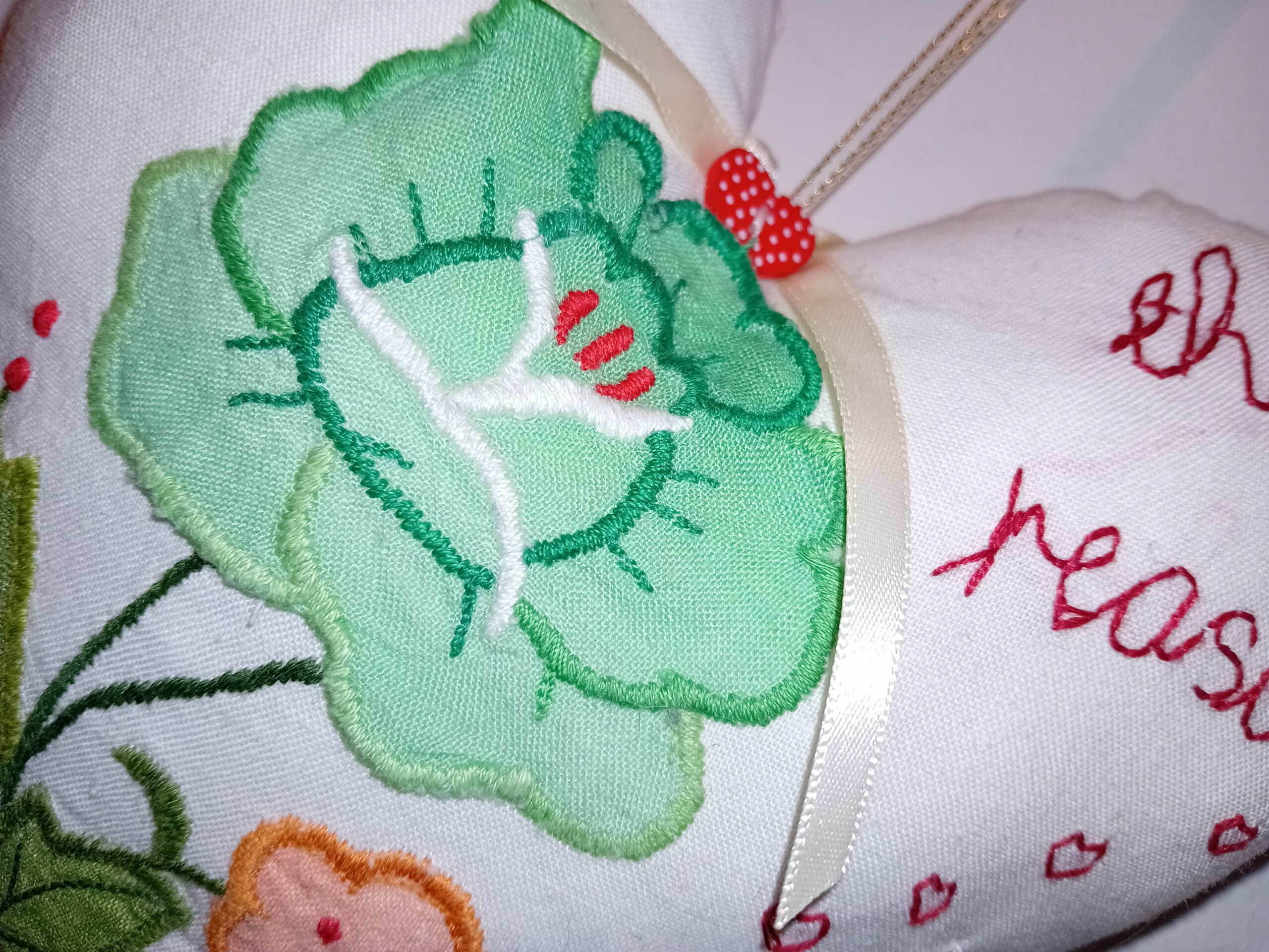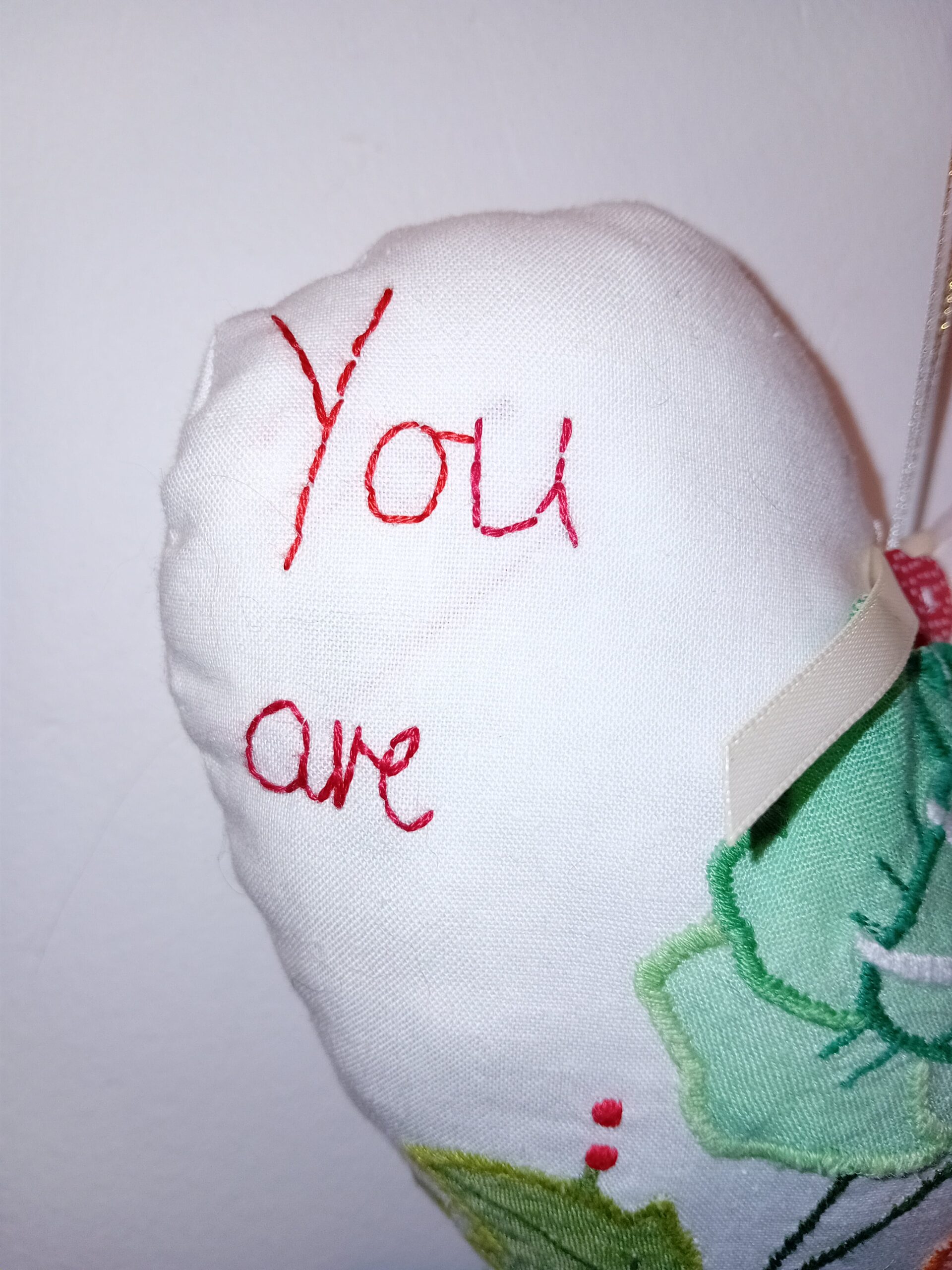 A one-of-a-kind hanging heart, handcrafted from upcycled linen and finished with a fun, hand-embroidered message designed to bring a smile to its new home. Each heart is unique and hangs beautifully on a wall, a door handle, or even the corner of a mirror — a tiny treasure made to brighten any space. Every heart has a story to tell, and every story deserves a home.