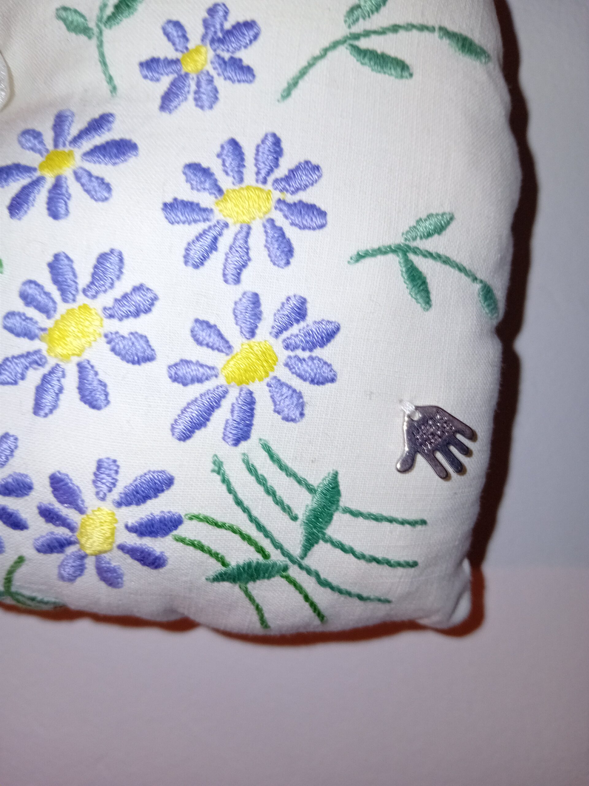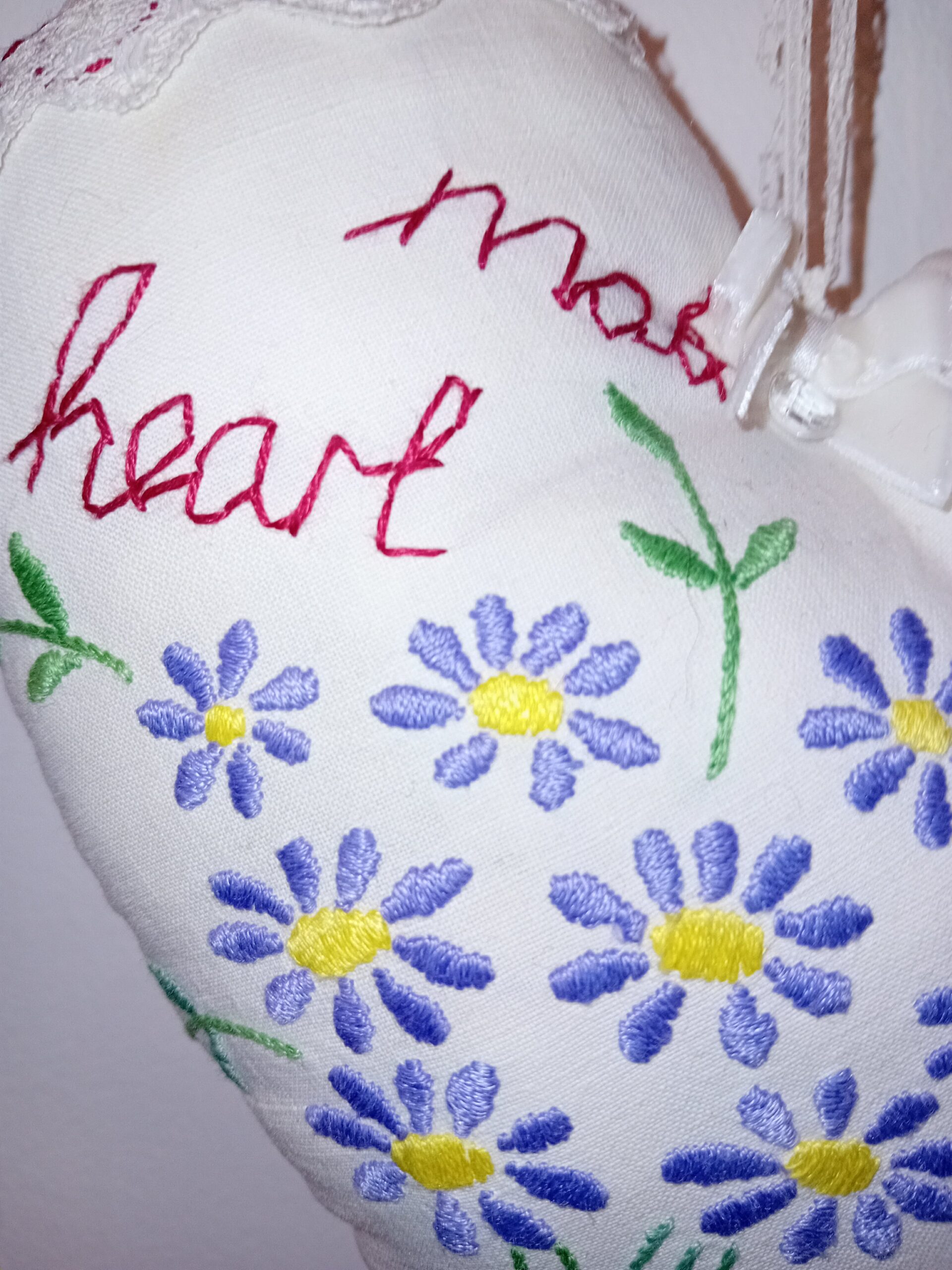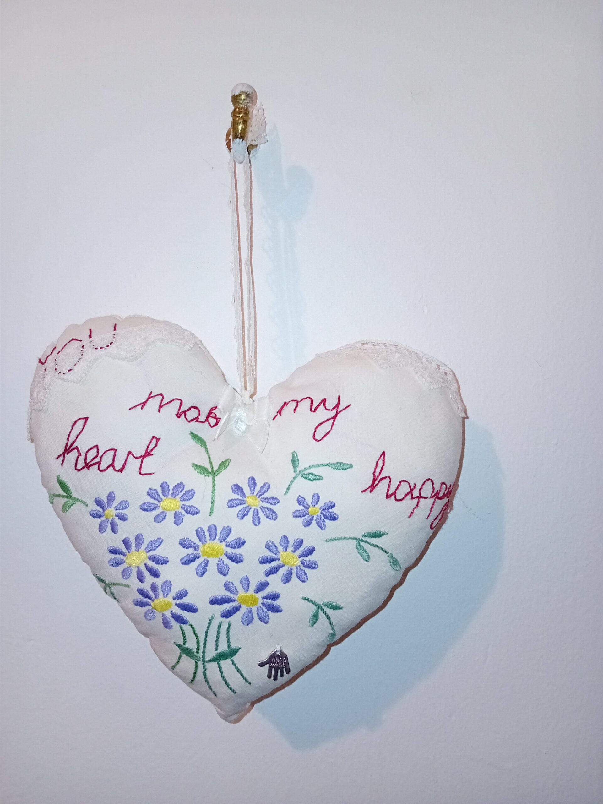 A one-of-a-kind hanging heart, handcrafted from upcycled linen and finished with a fun, hand-embroidered message designed to bring a smile to its new home. Each heart is unique and hangs beautifully on a wall, a door handle, or even the corner of a mirror — a tiny treasure made to brighten any space. Every heart has a story to tell, and every story deserves a home.