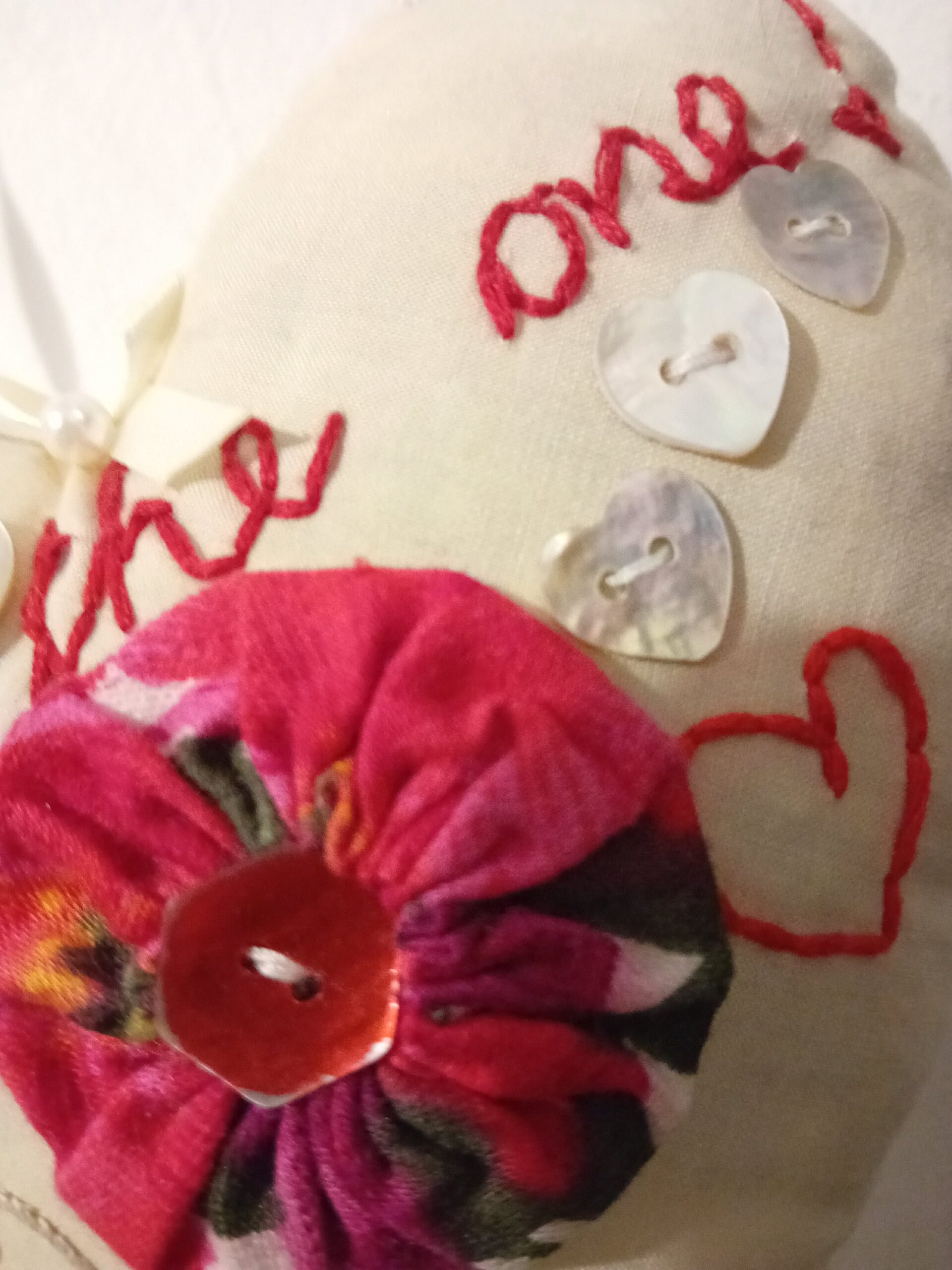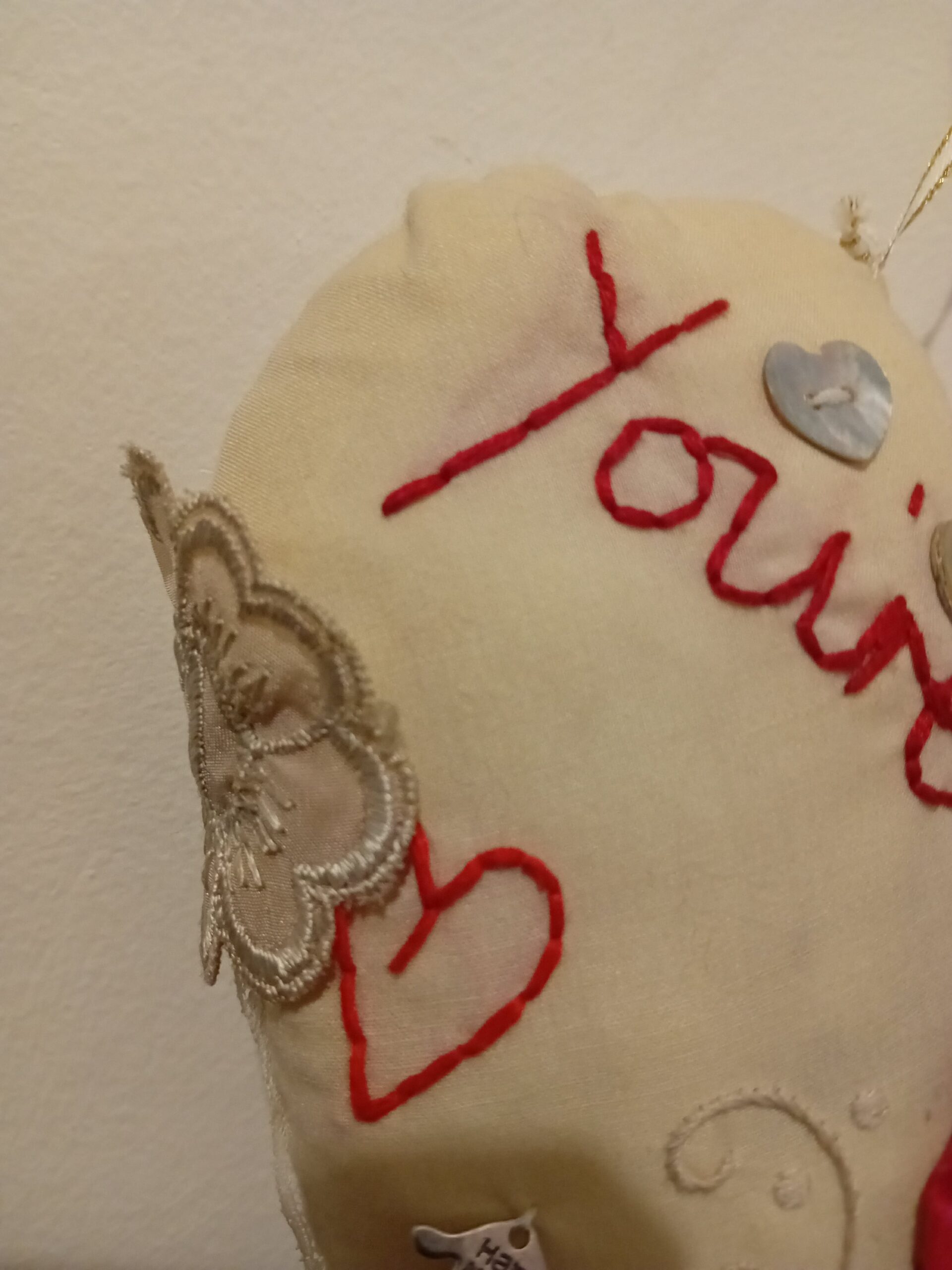 A one-of-a-kind hanging heart, handcrafted from upcycled linen and finished with a fun, hand-embroidered message designed to bring a smile to its new home. Each heart is unique and hangs beautifully on a wall, a door handle, or even the corner of a mirror — a tiny treasure made to brighten any space. Every heart has a story to tell, and every story deserves a home.